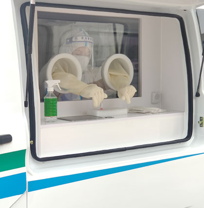 集成正壓防護、溫度調節(jié)、樣品傳遞、車內消毒等功能,可迅速部署于戶外,為群體核酸咽拭子采樣、樣品登記及樣品整理提供有力支撐。