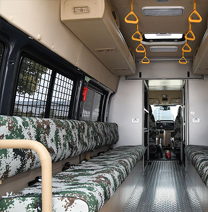 車內(nèi)兩側(cè)各設(shè)置一組鋼制長(zhǎng)條座柜,上部配備高密度汽車海綿沙發(fā),外包真皮面料,沙發(fā)套迷彩座椅布套,可拆卸更換,柜體通過(guò)掀開(kāi)坐墊可存放裝備。